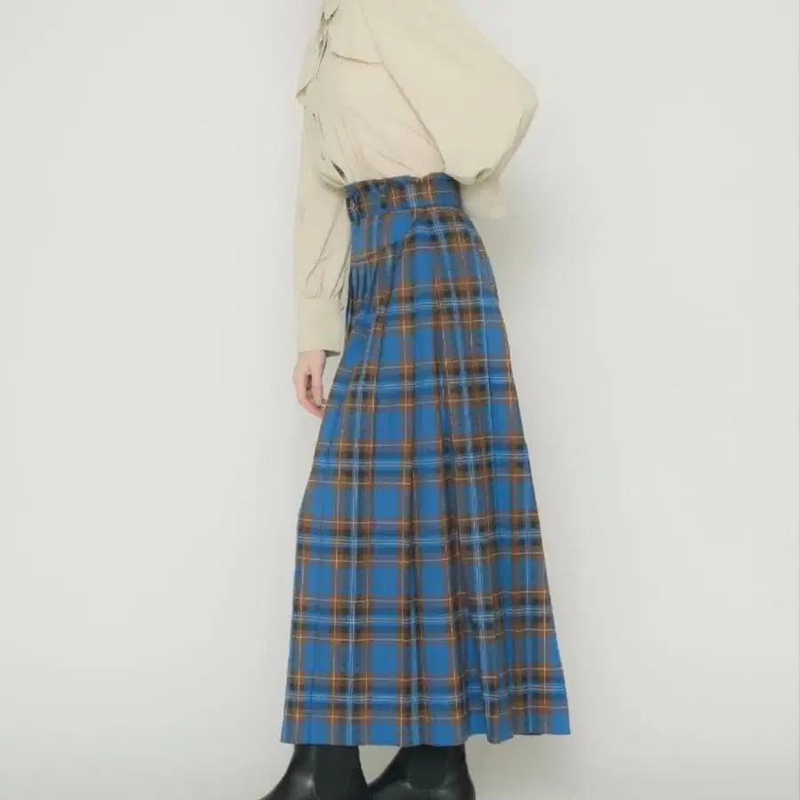 이 계절에 빼놓을 수 없는 타탄 체크 스커트입니다. 풍성한 플리츠와 롱한 기장은 빈티지 시크한 분위기를 연출합니다.