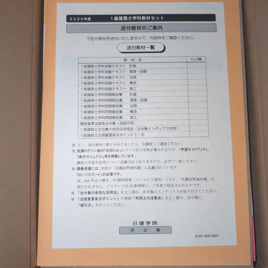 2026년도 1급 건축사 닛켄 학원 교재 법령집, 활용집, 문제집 포함입니다. 밑줄 표시는 하지 않았습니다. 다른 학원으로 옮기기 위해 판매합니다. 이사로 인해 받은 상태 그대로 보내드립니다. - 연도: 2026년도 - 학교명: 닛켄 학원 - 교재명: 법령집의 유효한 활용법 - 교재명: The First Class Architect - 교재명: Portable Best Questions 발송은 연내라면 편의점 발송이 가능하지만, 연초에는 부재중이므로 5일 이후가 됩니다.
