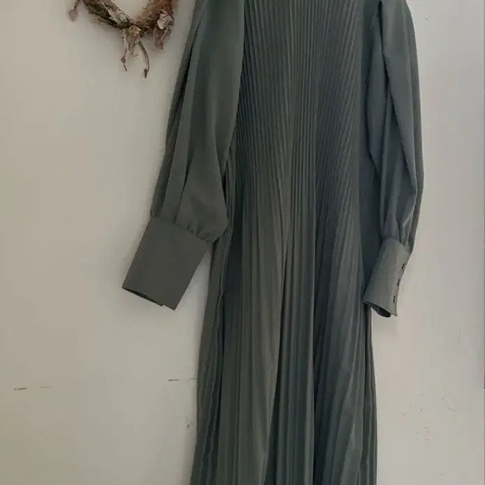 자동 번역되었어요. 원문보기그레이 플리츠 디자인의 긴팔 원피스, 버튼 3개 포함.