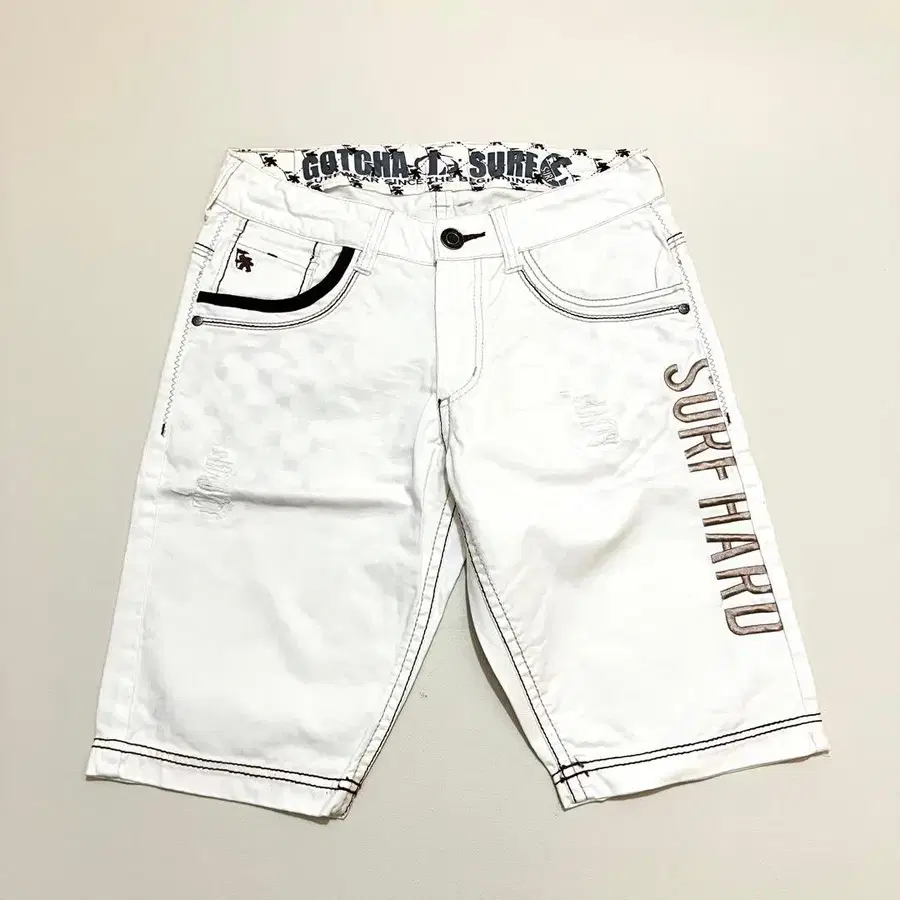 GOTCHA y2k 자수 데님 하프 팬츠 가죽 패치 화이트 L