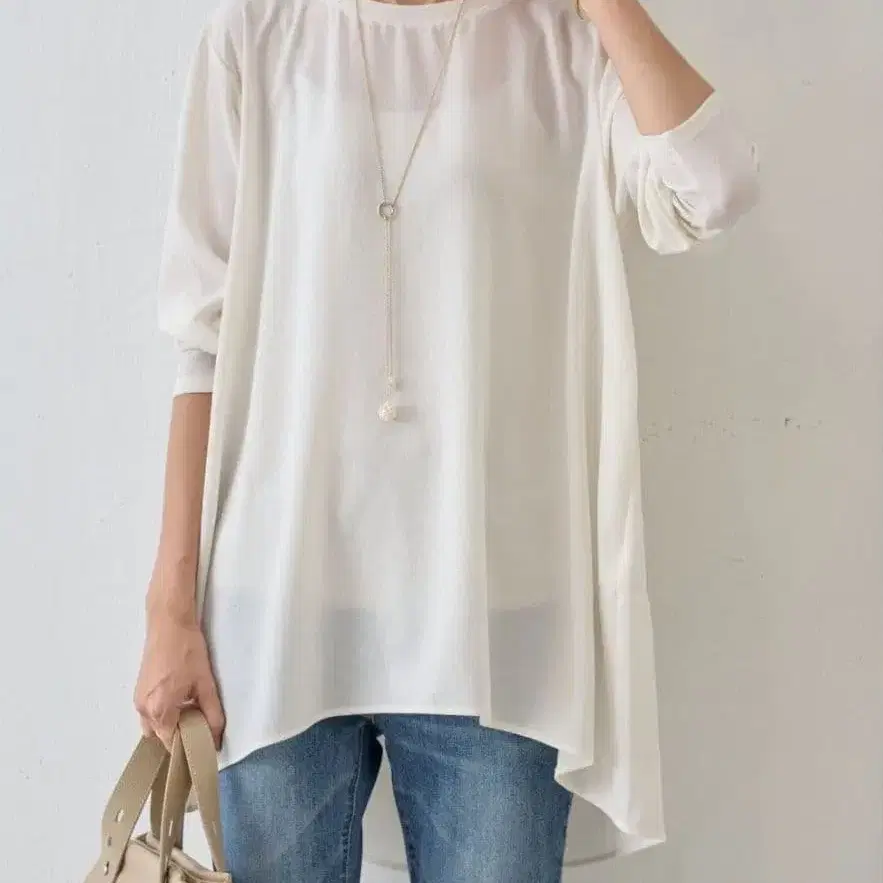 가벼운 화이트 색상의 긴팔 상의로 캐주얼한 레이어드 스타일을 즐길 수 있습니다.