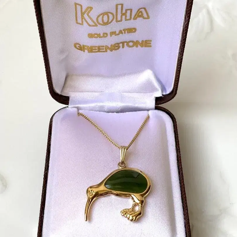 ***** [ 자기소개 ] 를 읽어주세요 ***** [ Koha ] 는 뉴질랜드의 주얼리 브랜드 [ Ariki New Zealand Jewellery ] 의 컬렉션 중 하나입니다. 뉴질랜드산 네프라이트 제이드 (그린스톤) 를 사용한, 골드 플레이트 마감이 특징인 키위새 (뉴질랜드의 국조) 모티브 디자인의 펜던트 목걸이. 그린스톤 (마오리어로 포우나무) 은 마오리 문화에서 매우 가치 있는 신성한 돌 (타옹가) 로, 지위와 권위를 나타내기 위해 장식품으로, 또한 평화를 구축하기 위해 사용되어 왔습니다. 물리적인 세계와 정신적인 영역 사이의 다리가 된다고 믿어지며, 착용자와 가족, 선조, 땅과의 깊은 연결을 상징합니다. - 탑 사이즈: 약 cm x cm - 목걸이 사이즈: 약 46.5cm ※ 늘린 길이 집에서 보관하고 있었기 때문에, 그 점을 이해하시는 분께서 구매해 주시면 감사하겠습니다.