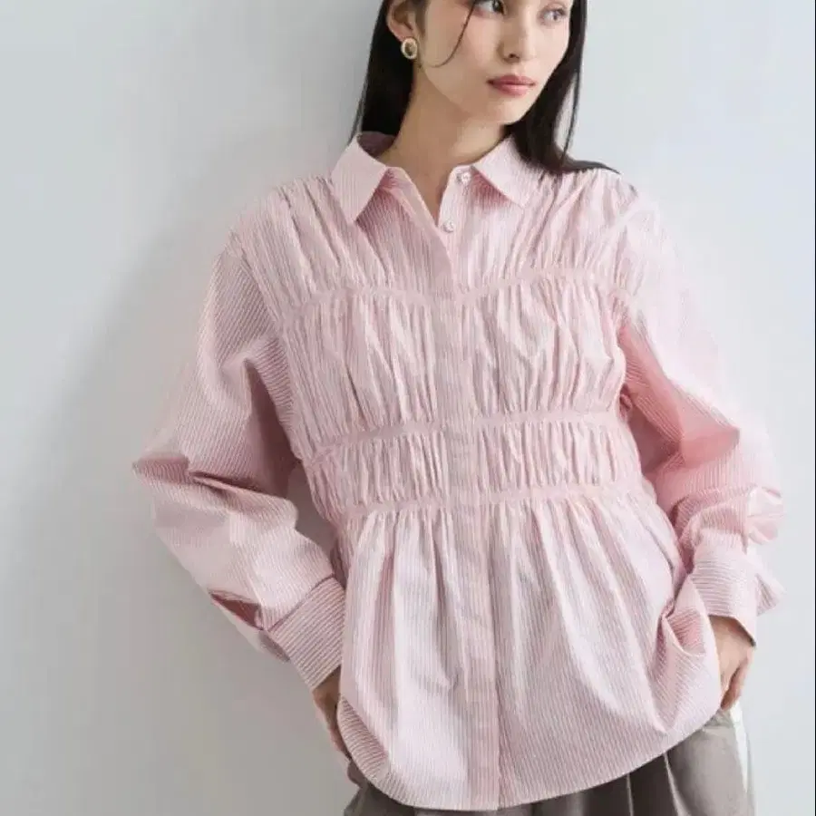 VIS 셔링 디자인 셔츠 핑크 스트라이프 셔츠