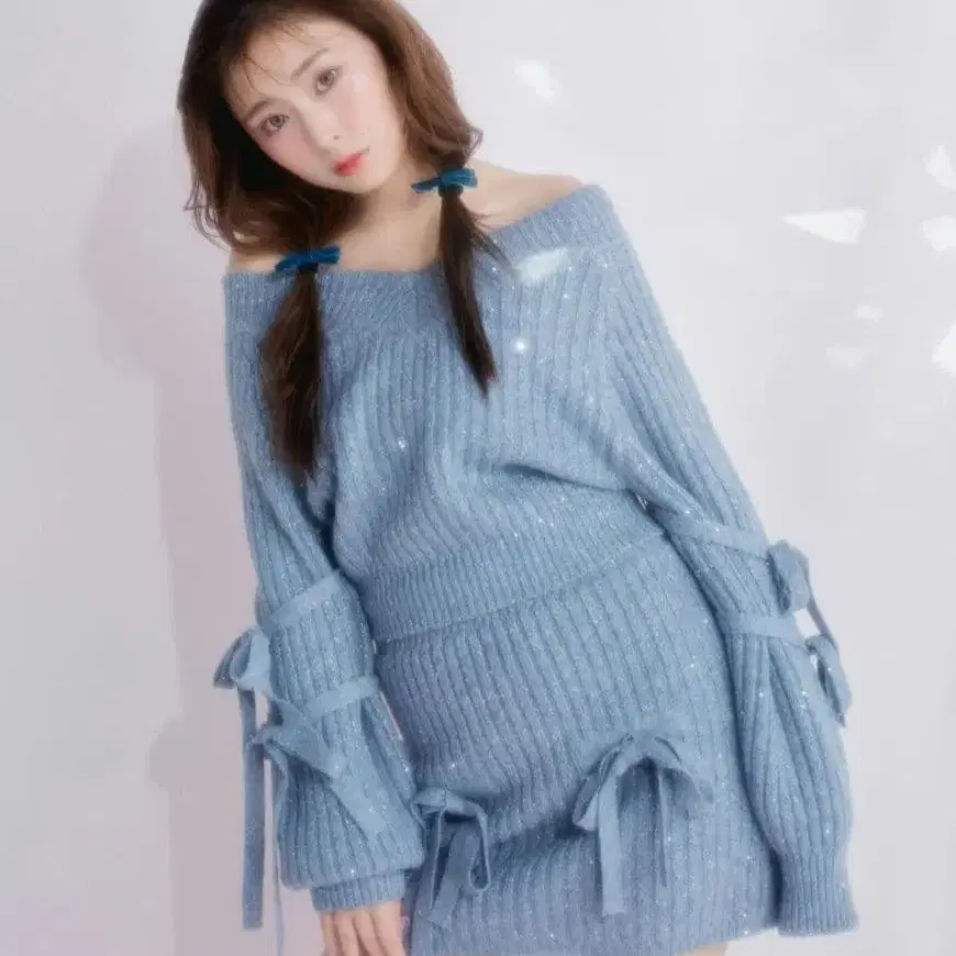 리본 포함 오프숄더 라이트 블루 니트 REDYAZEL