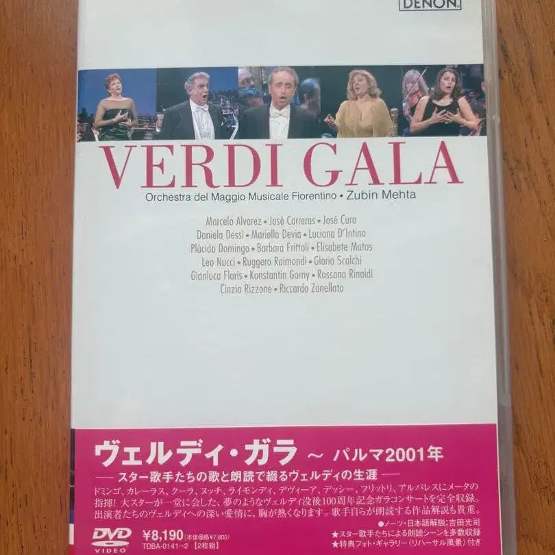 2001년 베르디 갈라, 오페라 명곡을 수록한 2장짜리 DVD, 일본어 자막 포함. 작곡가 베르디 사후 100주년을 기념하여 2001년 이탈리아 파르마에서 열린 초호화 갈라 콘서트 (특별 연주회)입니다. 주빈 메타 지휘, 도밍고, 칼레라스, 다니엘라 데시, 호세 쿠라, 마르셀 알바레스, 레오 누치, 루제로 라이몬디, 바르바라 프리톨리 등 세계적인 탑 가수들이 총출동하여 베르디의 대표작에서 명곡들이 연주된 역사적인 이벤트의 영상 작품입니다. 리허설 장면의 특별 사진 포함. 이처럼 많은 스타들이 한자리에 모이는 것 자체가 매우 어려운 일이며, 그 의미에서도 정말 호화롭고 구하기 어려운 2장짜리입니다. 베르디를 좋아하시는 분, 오페라를 좋아하시는 분께 양도해 드리고 싶습니다. 또한, 다른 오페라 및 발레 작품도 판매 중이니 함께 보시면 감사하겠습니다. 잘 부탁드립니다. - 타이틀: VERDI GALA - 오케스트라: Orchestra del Maggio Musicale Fiorentino - 지휘자: Zubin Mehta - 연도: 2001년 - 장르: 오페라 - 언어: 이탈리아어 - 디스크 수: 2장 방문해 주셔서 감사합니다. #주세페 베르디 #주빈 메타 #도밍고 #라이몬디 #칼레라스 #도밍고 #프리톨리 #알바레스 #호세 쿠라 #누치 #나부코 #해적 #리골레토 #춘희 #운명의 힘 #아이다 #오텔로 #가면무도회 #돈 카를로 #팔스타프 #예루살렘