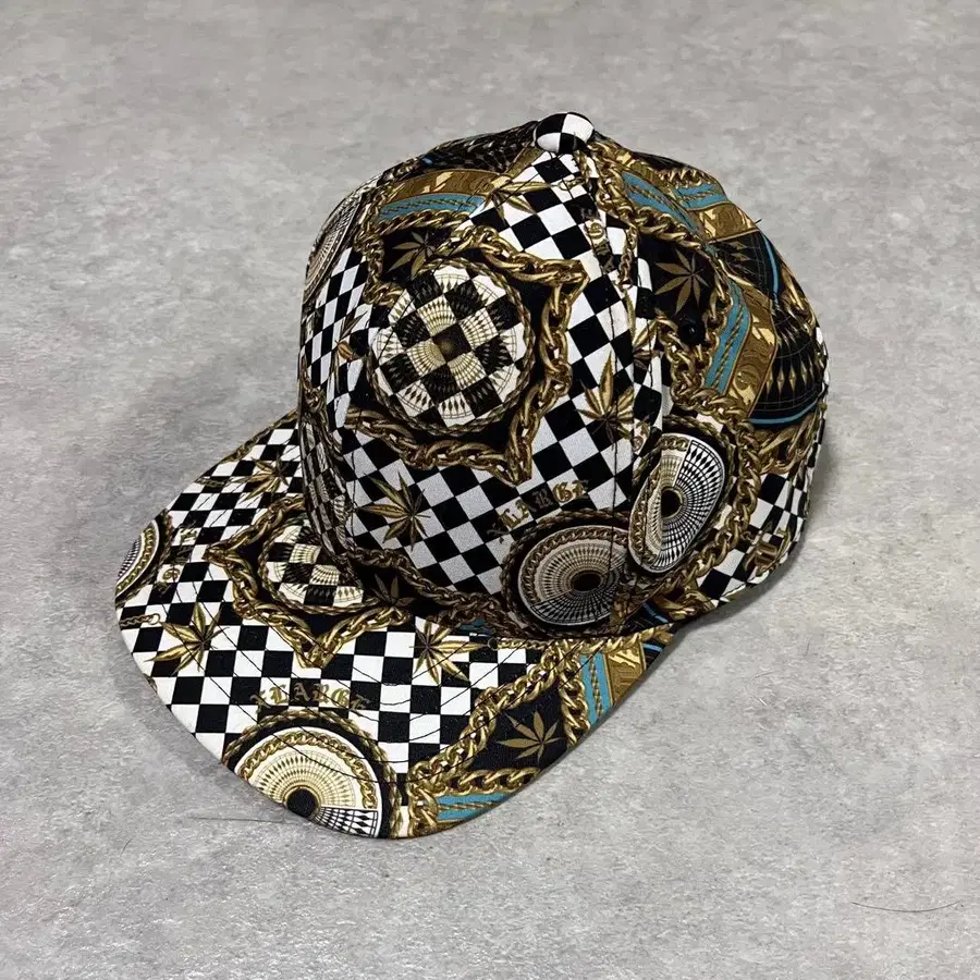 자동 번역되었어요. 원문보기장식적인 원형 디자인과 체커 패턴 키헤이 체인 패턴의 스냅백 캡.