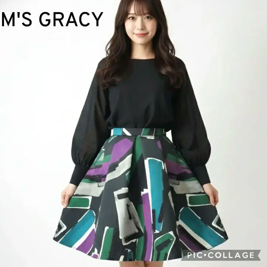 새상품급 M'S GRACY 턱 플레어 스커트 새틴 A라인 기하학 일본제