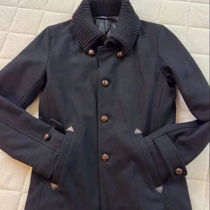 자동 번역되었어요. 원문보기리브가 있는 옷깃과 우드풍 버튼이 특징인, 고급스러운 디자인의 남성용 멜톤 코트입니다.