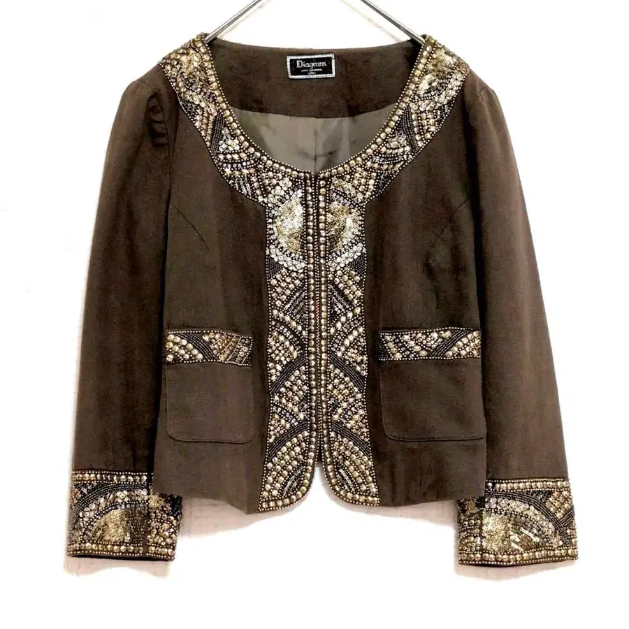 비즈 자수가 놓인 브라운의 노카라 자켓.