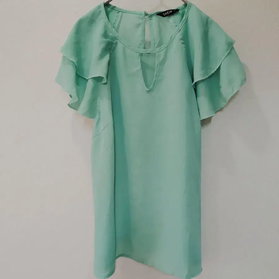 자동 번역되었어요. 원문보기민트 그린 색상의 프릴 소매 디자인으로, 백에 버튼이 달린 반팔 상의입니다.