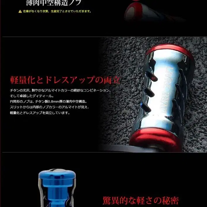 원통형 노브는 티타늄제 0.8mm 두께의 얇은 중공 구조입니다. 슬릿에서는 내부 노브 컬러의 알루마이트가 보이며, 경량화와 드레스업을 양립하고 있습니다.