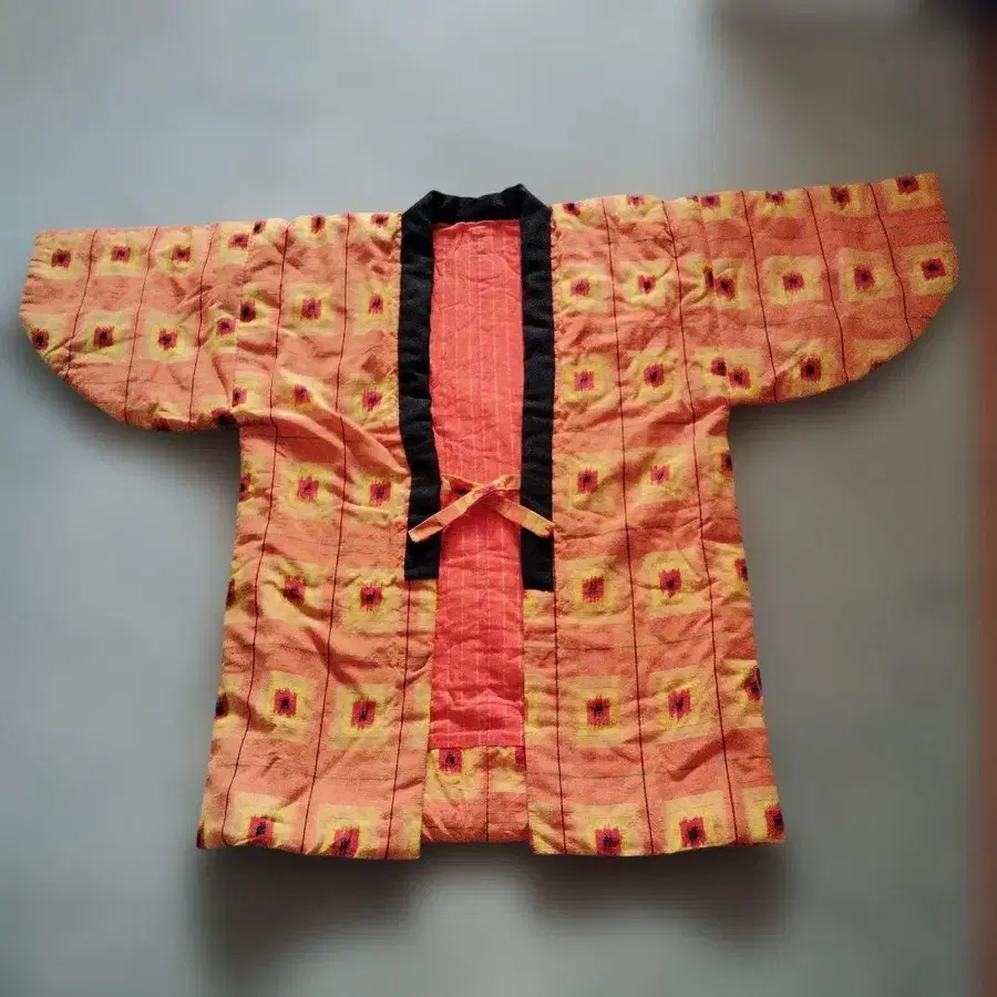 쇼와 레트로 오렌지와 블랙 꽃무늬 면 누빔 손바느질 반텐