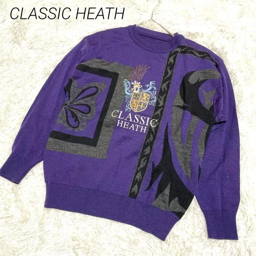 그래픽 프린트가 특징인 보라색 니트 스웨터.