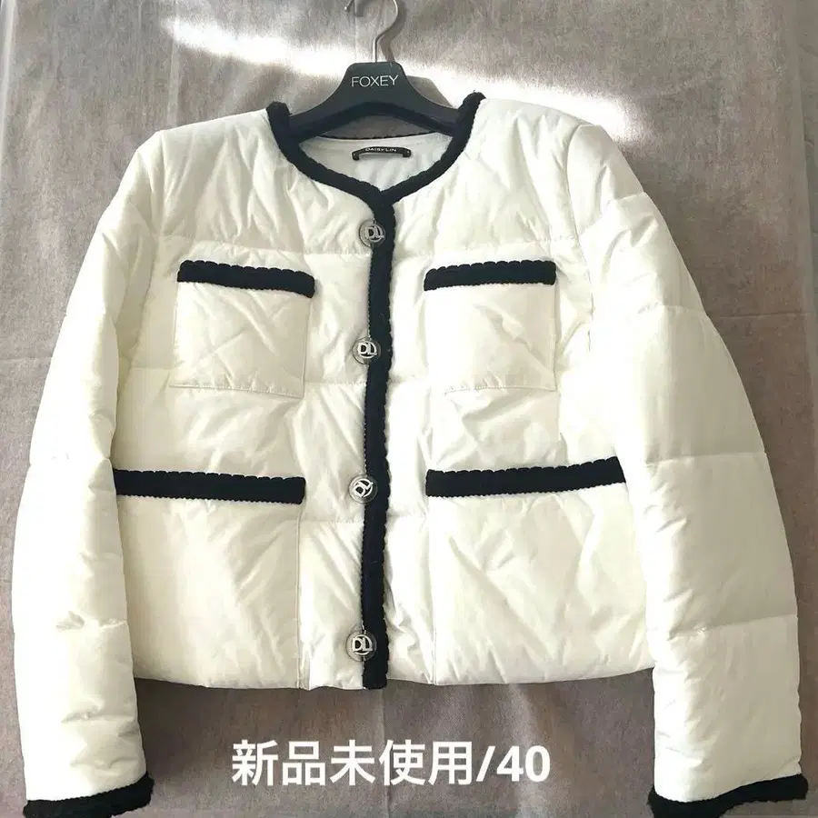 화이트 베이스에 블랙 파이핑으로 캐주얼하기 쉬운 다운 자켓을 한 단계 위의 스타일로 승화시킨 데이지린만의 디자인입니다.