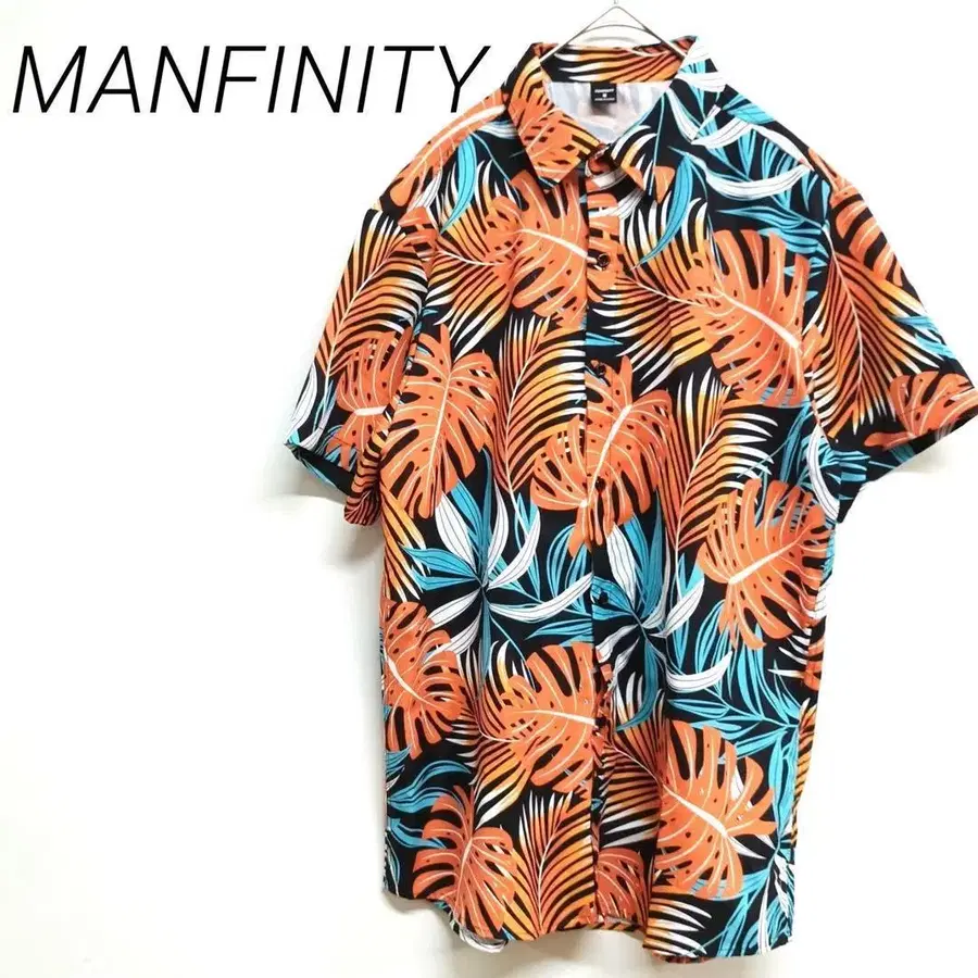 트로피컬 패턴의 반팔 하와이안 셔츠, M 사이즈, 오렌지와 파랑 색감이 특징.