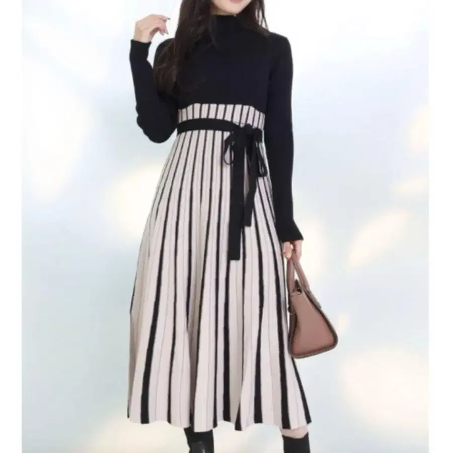 MERCURYDUO 배색 체인지 리브 롱 슬리브 니트 원피스