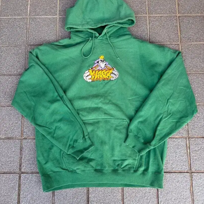 그린 컬러 후드 부착 후드티 캐릭터 자수