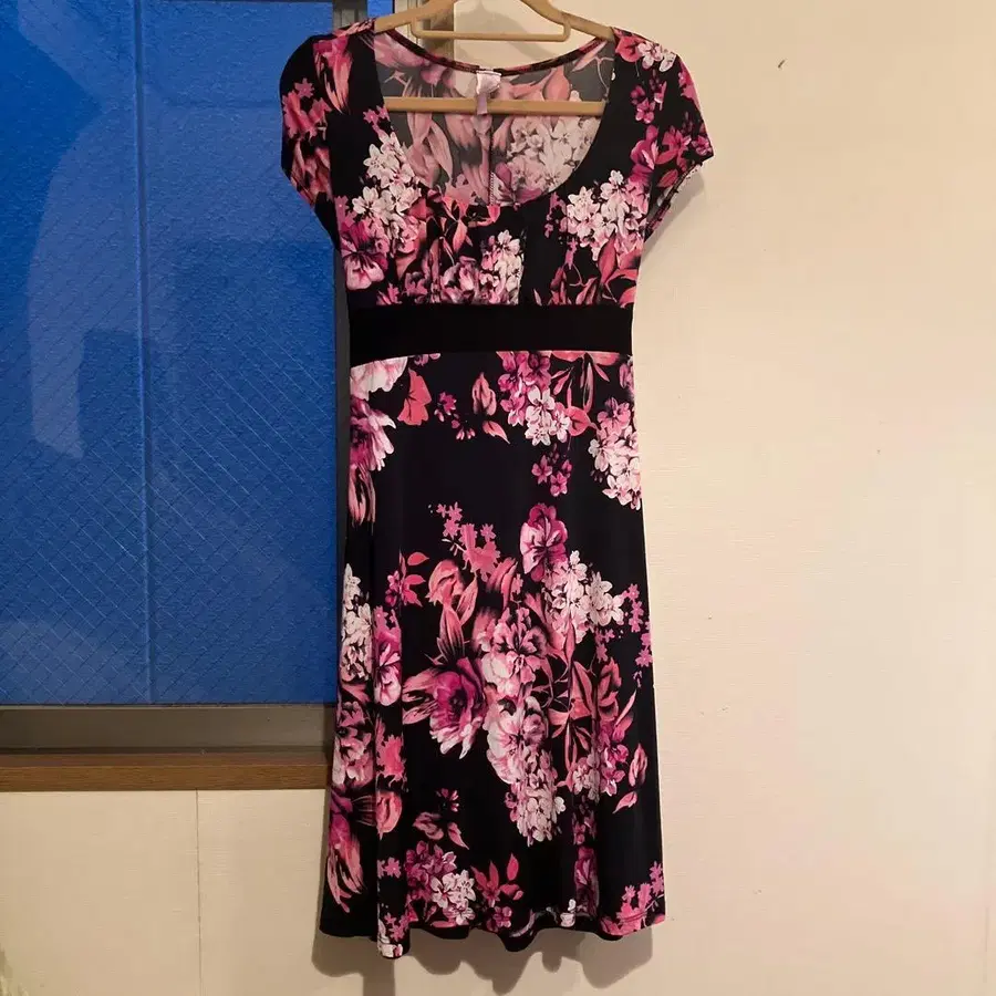 블랙과 핑크의 꽃무늬 스트레치 원피스