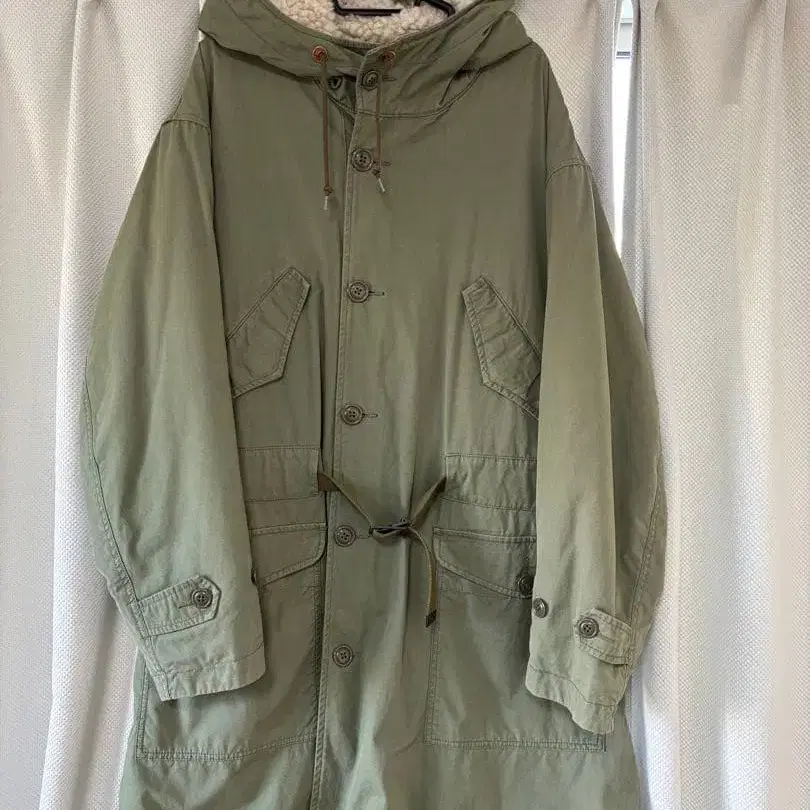 겉감은 워싱 처리된 듯한 코튼 원단이며, 바디 안감은 보아 원단, 소매 안감은 충전솜이 들어간 새틴 원단입니다.