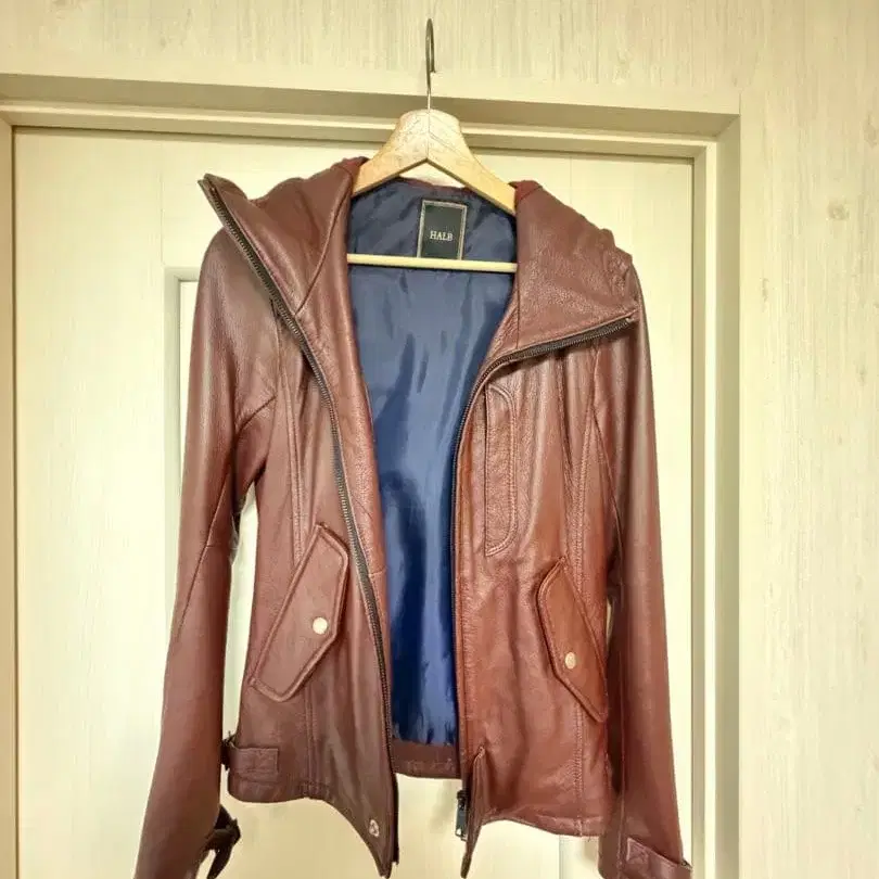 HALB 후드 부착 브라운 가죽 라이더 자켓