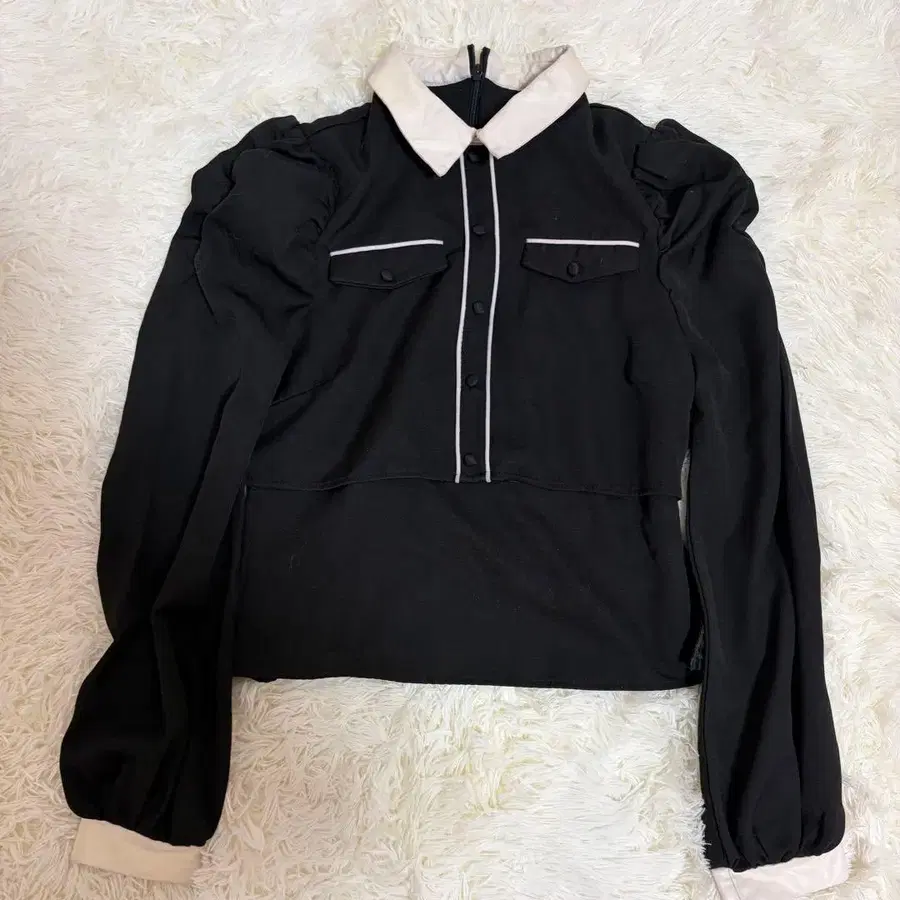 BUBBLES 파이핑 블라우스 버블스 카라 부착 퍼프 슬리브 블랙