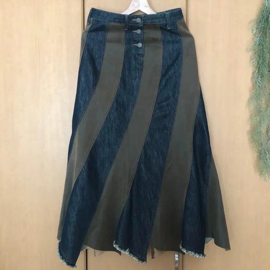 패치워크 데님 & 가죽 느낌 롱 스커트