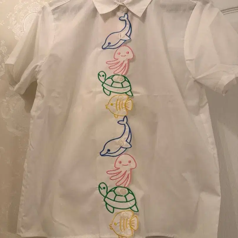 Honey Marble 바다 생물 자수 반팔 블라우스 셔츠