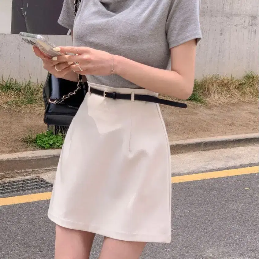 그레이 상의와 화이트 타이트 스커트