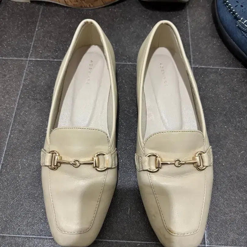 베이지 로퍼 타입 펌프스 골드 금장 장식
