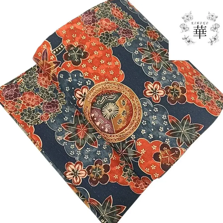 네이비 컬러 베이스의 전통 후쿠로 오비입니다. 꽃과 구름, 모던한 패턴이