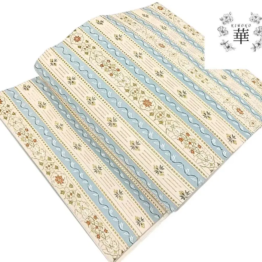 화 후쿠로 오비 스트라이프 양풍 꽃 베이지 스카이블루