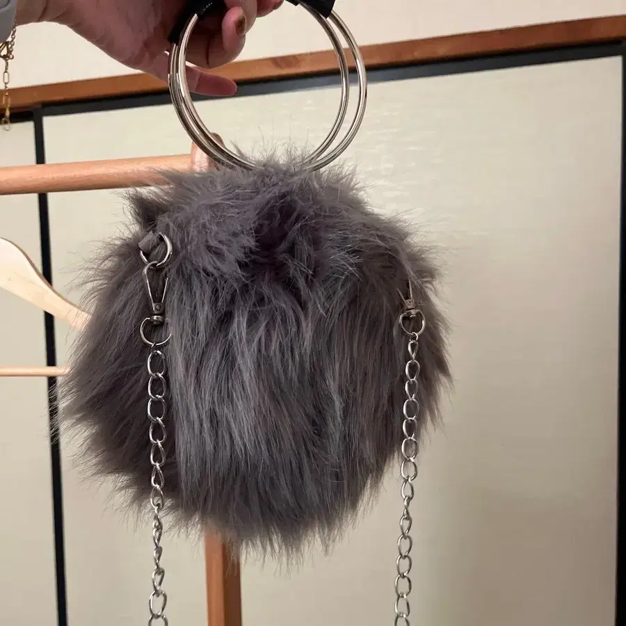 그레이 퍼 폼폼 숄더백 한국 스타일