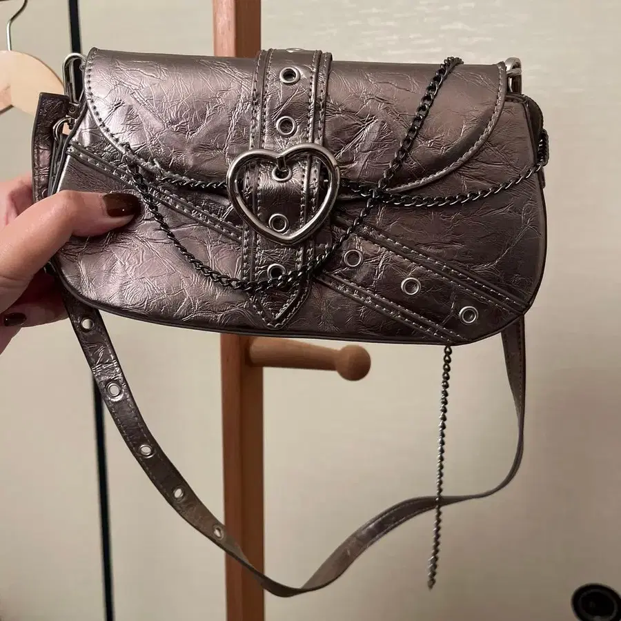 한국 스타일 메탈릭 실버 숄더백 하트 금장 장식 포함