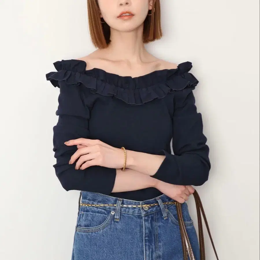 [ 새상품급 ] 프릴 달린 네이비 오프숄더 긴팔 상의