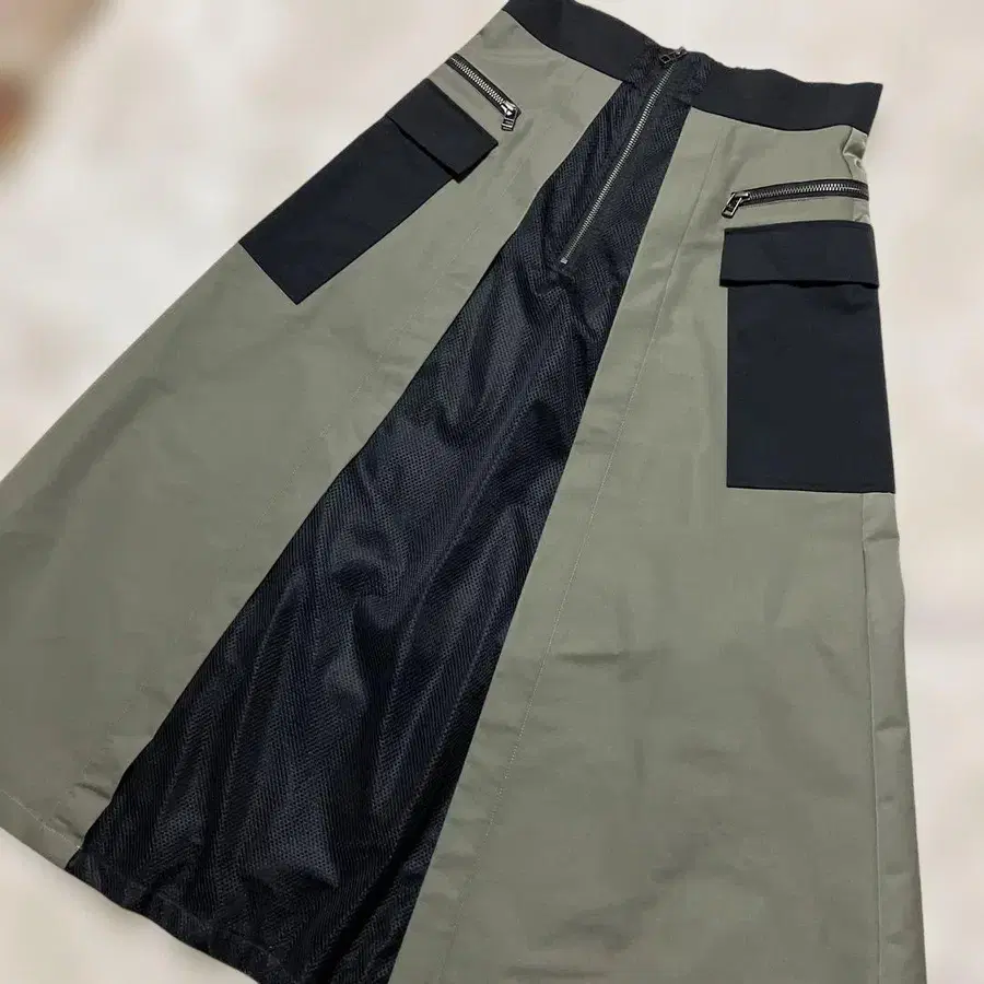 아틀리에 시크 카키 x 블랙 플레어 스커트 지퍼 포켓 부착