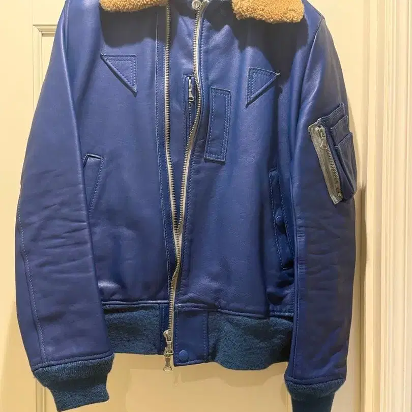 SEVESKIG 파랑 가죽 자켓 보아 카라 부착