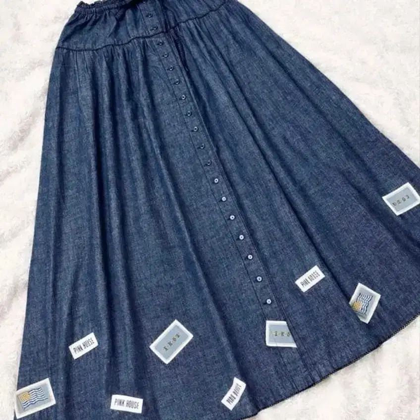 PINK HOUSE 데님 롱 스커트 와펜 올 패턴 프론트 오픈 면 인디고