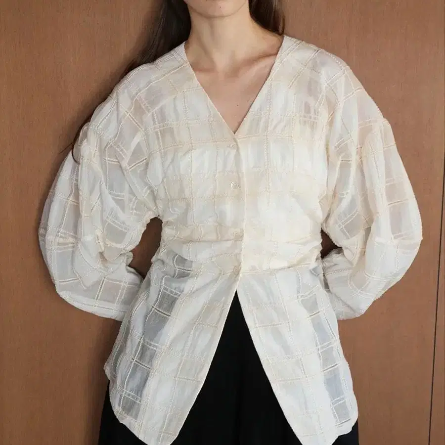 뒷면은 깊은 V넥으로 내추럴함을 더하고, 가는 리본과 적당한 시스루가 캐주얼한 체크 원단을 레이디처럼 연출해 줍니다.