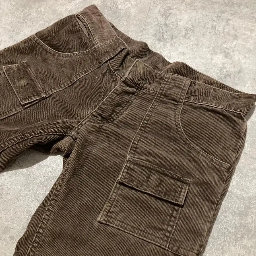 전면의 작은 플랩 포켓이 달린 베이커 팬츠와 같은 디자인이 특징인 코듀로이 팬츠.