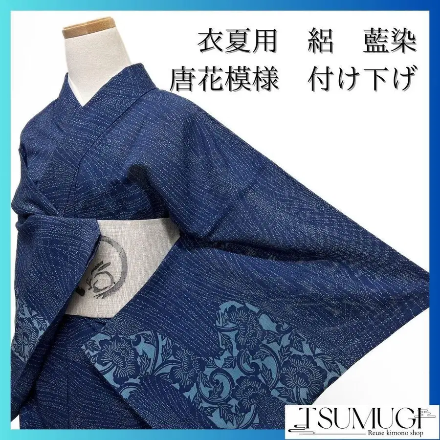 여름용 명주 네이비 나염 유선 당화 무늬 츠케사게 기모노 035a p
