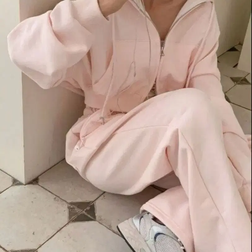 핑크 후드 부착 맨투맨 셋업