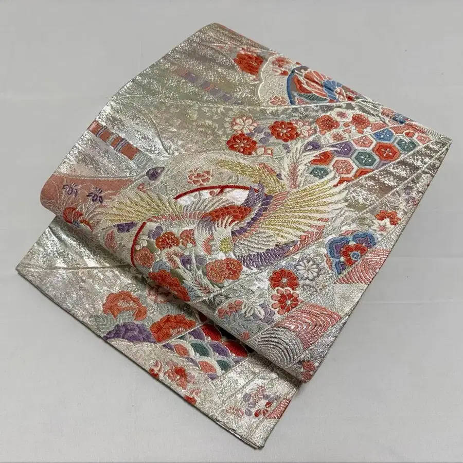 A 봉황과 꽃들 화문 금은사 순수 실크 육통 후쿠로 오비 포멀 O21