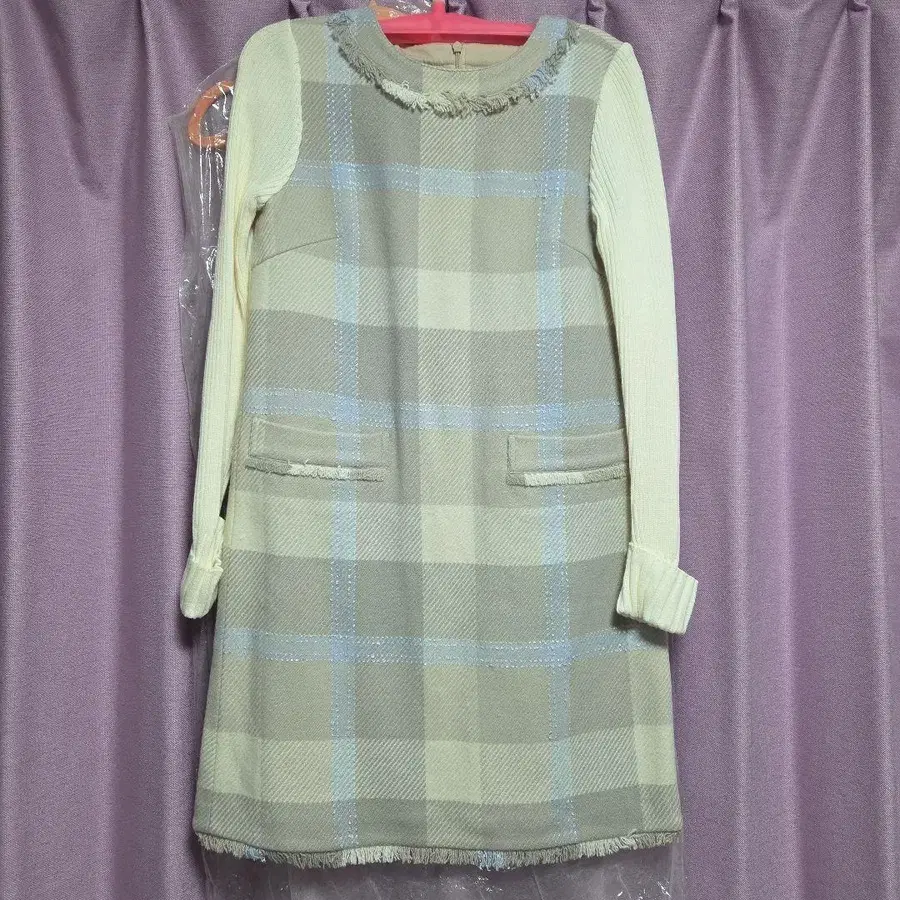 그레이 계열 체크 긴팔 무릎 기장 원피스