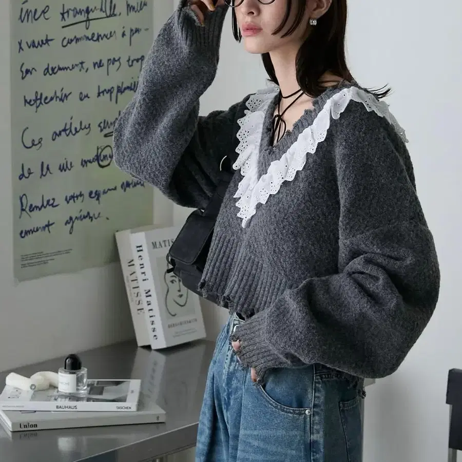 [ forksy. ] 개더 레이스 크롭 기장 데미지 니트