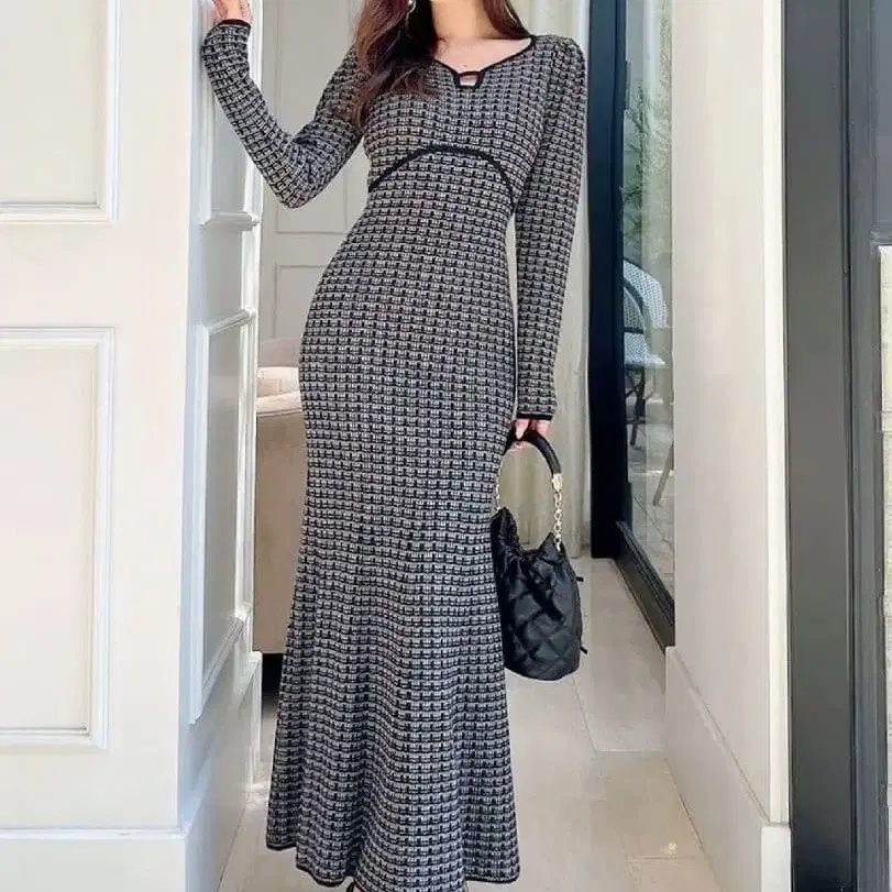 [ RESEXXY ] 바이컬러 트위드 니트 원피스 블랙