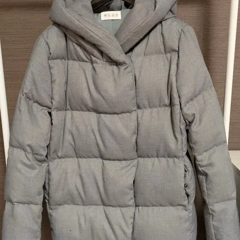 그레이 후드 부착 퀼팅 다운 자켓 플라스테