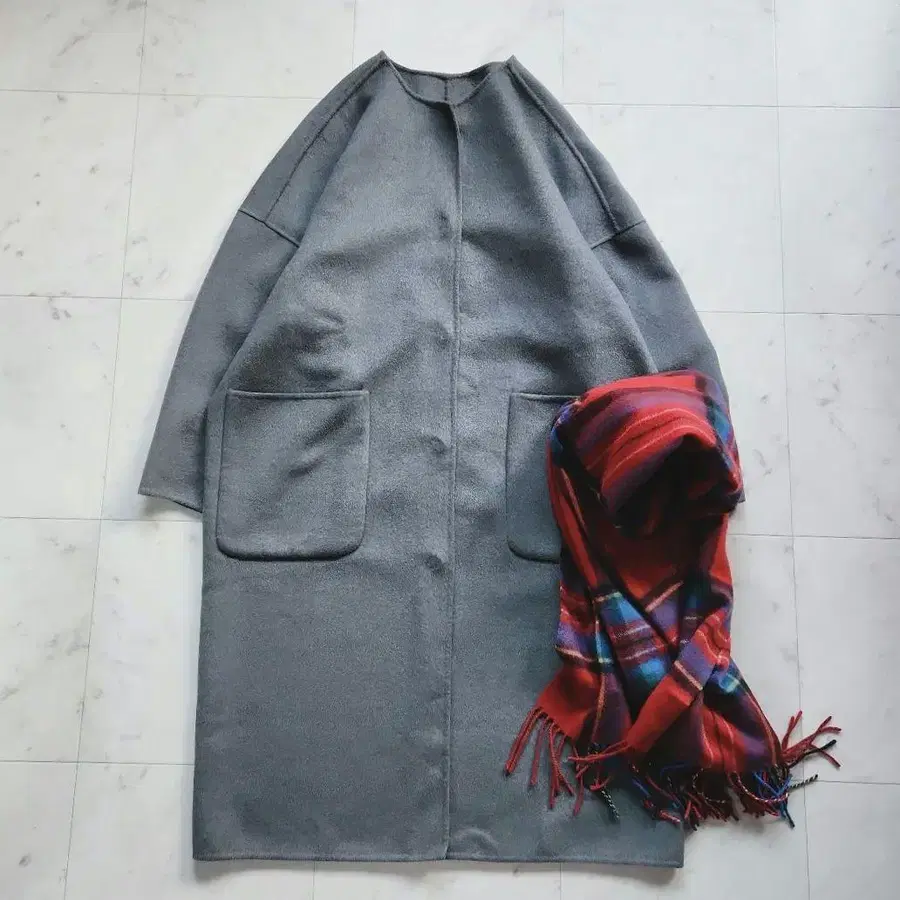 여유로운 사이즈감 & 깔끔한 노카라 디자인이 매력적인 롱 코트, 두꺼운 니트와 레이어드해도 좋아요.