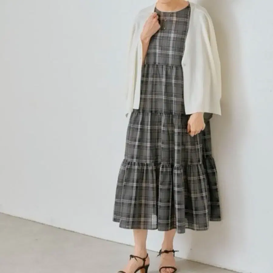 시어한 느낌의 체크 무늬가 시원해 보이는 원피스입니다. 모노톤 베이스이지만, 화이트 라인이 산뜻한 인상을 줍니다. 티어드 디자인으로 약간 달콤한 느낌입니다. 가슴 부분의 절개가 다리를 길어 보이게 해주고, 몸의 라인이 드러나지 않는 실루엣입니다. 샌들을 매치하여 원피스로 단품으로 입는 것은 물론, 뒷면은 밑단까지 버튼이 있어 개폐가 가능하므로 롱베스트로도 활용 가능할 것 같습니다.