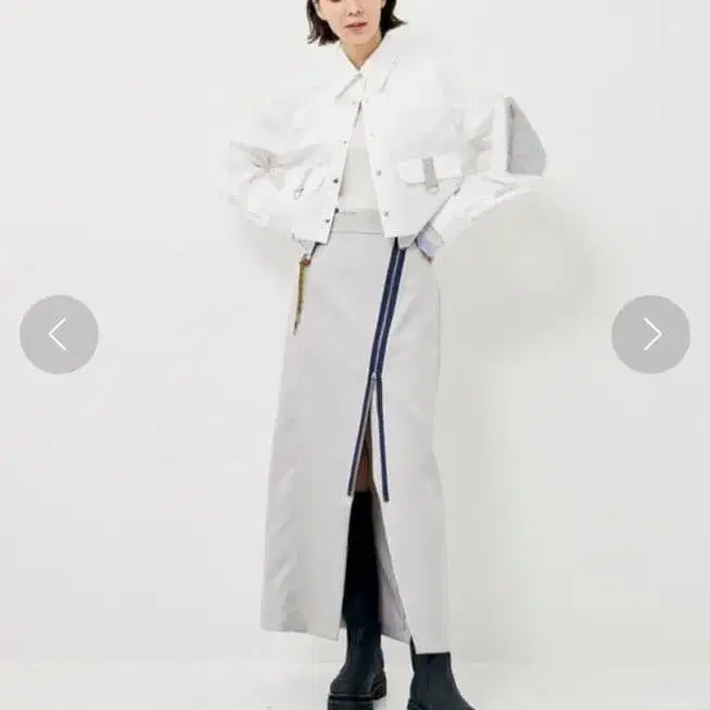 디자인: 압도적으로 착용감이 좋으면서도 편안한, 아름다운 실루엣의 스커트. 코디네이트에 어려움이 없는 심플한 디자인. 대담한 랩 스타일 디자인과 카라비너로 독특한 아이템. 원 포인트로 활용한 등산 등에 사용되는 카라비너. 전면부의 ZIP을 열어 슬릿 길이를 조절 가능. 소재: 적당한 광택감과 탄력, 볼륨감이 있어 고급스러운 소재를 채용. 적절한 탄력감이 있어 타이트한 실루엣임에도 신체의 라인을 너무 드러내지 않음. 비침 없음. 안감 없음.