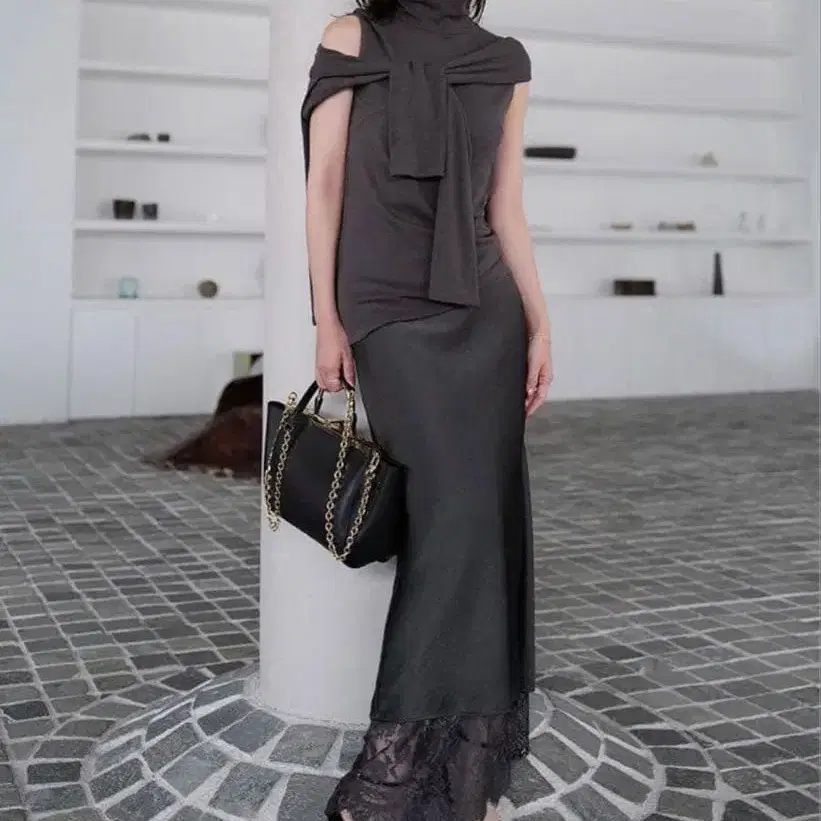 원단의 매력을 살리기 위해 바이어스 처리로 심플하게 떨어지는 실루엣을 만들었습니다.
